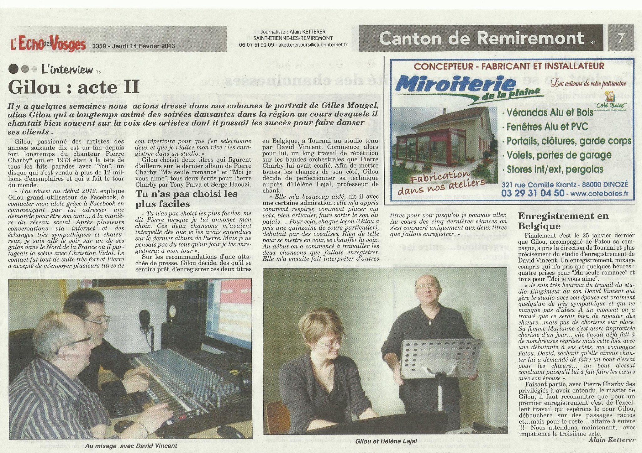 Cette semaine, nous portons à votre connaissance un article paru en février dernier dans le Journal « L’Echo des Vosges » relatant l’incroyable aventure de Gilles Mougel ce passionné de variétés qui s’est lancé le défi d’enregistrer un cd, mais pas n’importe quel Cd, puisque Gilou comme l’appelle ses amis s’est entouré de professionnels du métier que sa sympathie a su séduire. La société DVM Production est partenaire de ce beau projet qui est relayé par la presse francaise tant au niveau de la presse écrite, que radiophonique par le biais de France Bleu.
